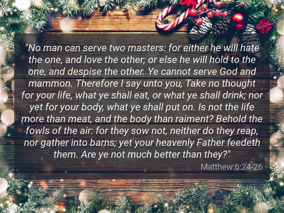“No man can serve two masters: for either he will hate the one, and love the other; or else he will hold to the one, and despise the other. Ye cannot serve God and mammon. Therefore I say unto you, Take no thought for your life, what ye shall eat, or what ye shall drink; nor yet for your body, what ye shall put on. Is not the life more than meat, and the body than raiment?” Matthew 6:24-25 KJV