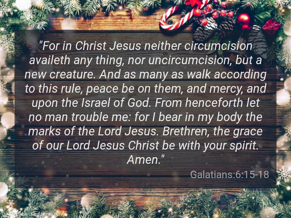 “For in Christ Jesus neither circumcision availeth any thing, nor uncircumcision, but a new creature. And as many as walk according to this rule, peace be on them, and mercy, and upon the Israel of God. From henceforth let no man trouble me: for I bear in my body the marks of the Lord Jesus. Brethren, the grace of our Lord Jesus Christ be with your spirit. Amen.” Galatians 6:15-18 KJV
