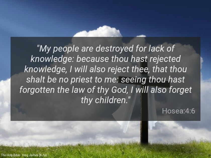 “My people are destroyed for lack of knowledge: because thou hast rejected knowledge, I will also reject thee, that thou shalt be no priest to me: seeing thou hast forgotten the law of thy God, I will also forget thy children” (Hosea 4:6)