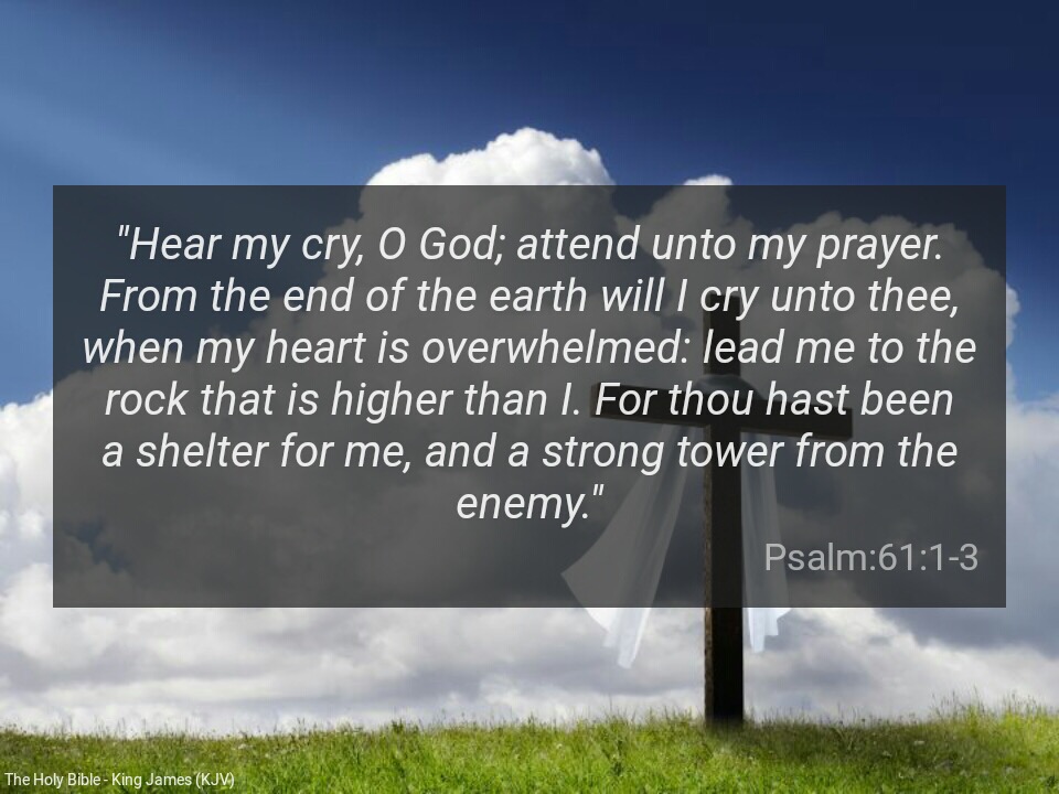“Hear my cry, O God; attend unto my prayer. From the end of the earth will I cry unto thee, when my heart is overwhelmed: lead me to the rock that is higher than I. For thou hast been a shelter for me, and a strong tower from the enemy” ( Psalm 61:1-3).