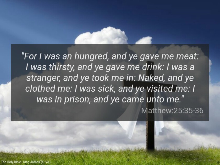 “For I was an hungred, and ye gave me meat: I was thirsty, and ye gave me drink: I was a stranger, and ye took me in: Naked, and ye clothed me: I was sick, and ye visited me: I was in prison, and ye came unto me” (Matthew 25:35-36).