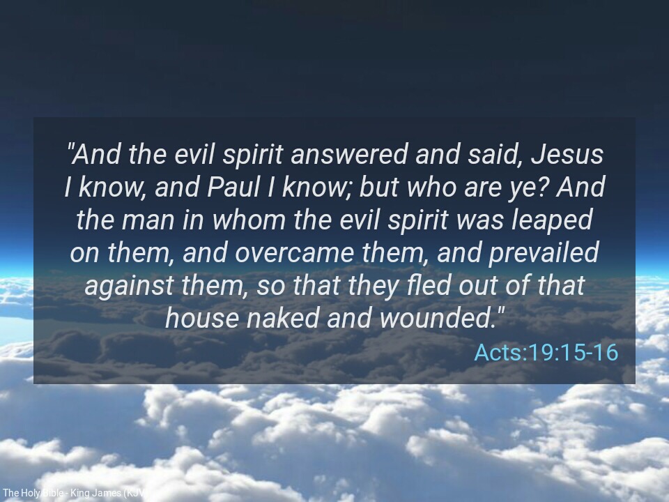 “And the evil spirit answered and said, Jesus I know, and Paul I know; but who are ye? And the man in whom the evil spirit was leaped on them, and overcame them, and prevailed against them, so that they fled out of that house naked and wounded” (Acts 19:15-16).