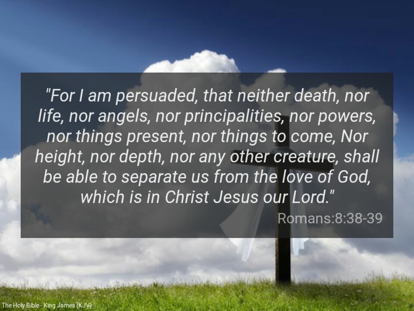 “For I am persuaded, that neither death, nor life, nor angels, nor principalities, nor powers, nor things present, nor things to come, Nor height, nor depth, nor any other creature, shall be able to separate us from the love of God, which is in Christ Jesus our Lord” (Romans 8:38-39).