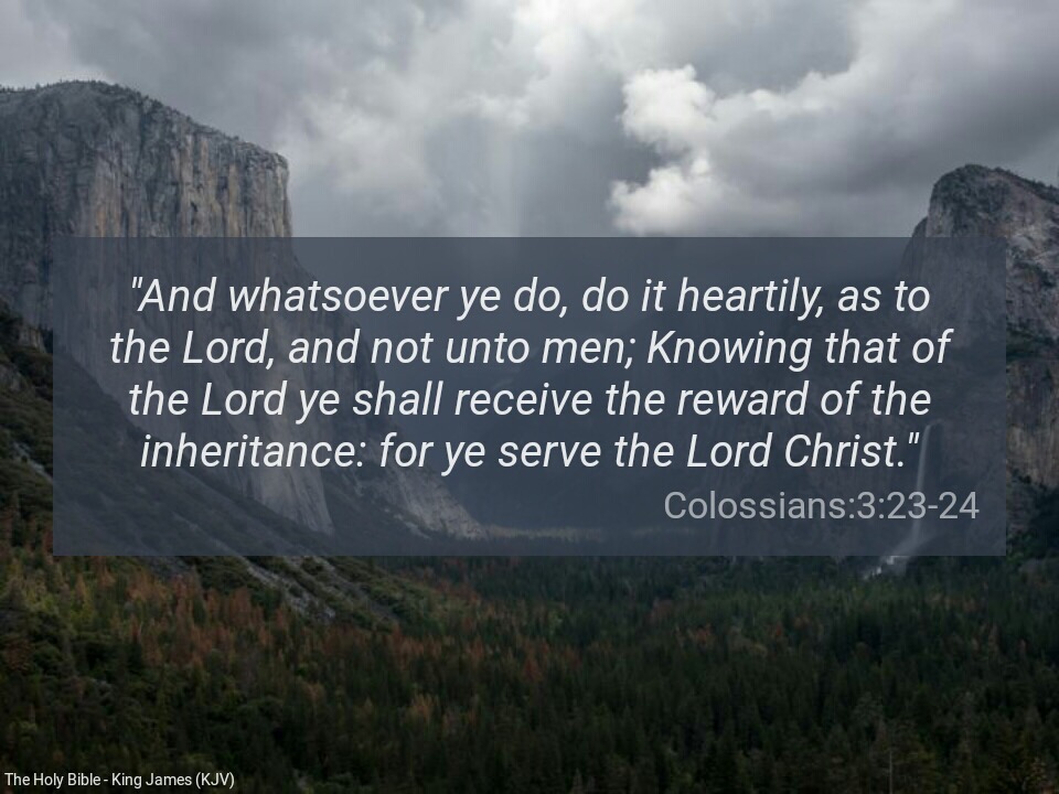 “And whatsoever ye do, do it heartily, as to the Lord, and not unto men; Knowing that of the Lord ye shall receive the reward of the inheritance: for ye serve the Lord Christ” (Colossians 3:23-24).