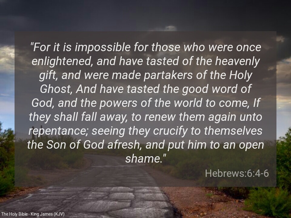 “For it is impossible for those who were once enlightened, and have tasted of the heavenly gift, and were made partakers of the Holy Ghost, And have tasted the good word of God, and the powers of the world to come, If they shall fall away, to renew them again unto repentance; seeing they crucify to themselves the Son of God afresh, and put him to an open shame” (Hebrews 6:4-6)