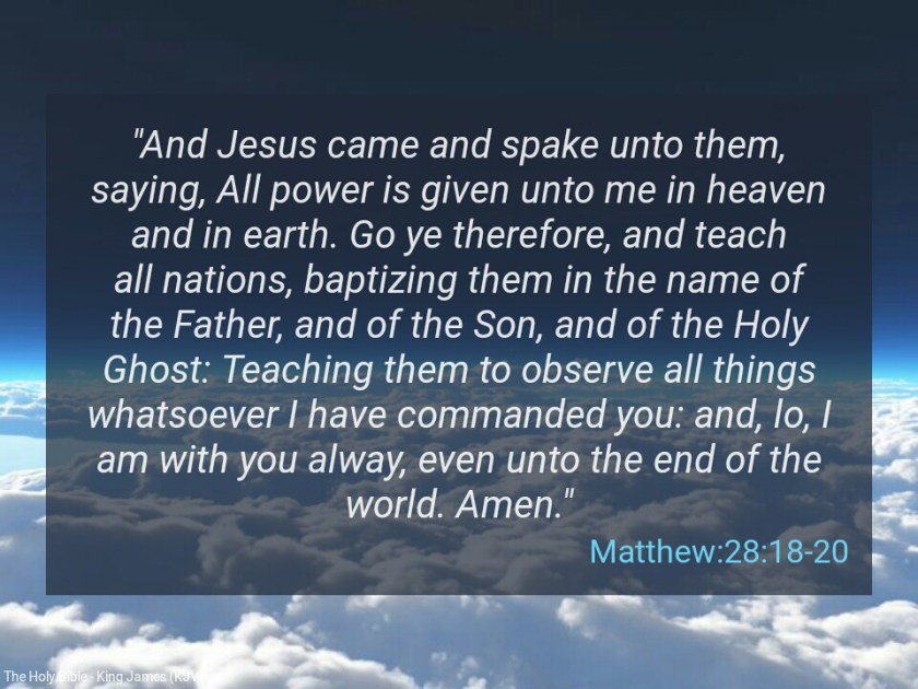 “And Jesus came and spake unto them, saying, All power is given unto me in heaven and in earth. Go ye therefore, and teach all nations, baptizing them in the name of the Father, and of the Son, and of the Holy Ghost:Teaching them to observe all things whatsoever I have commanded you: and, lo, I am with you alway, even unto the end of the world. Amen” ( Matthew 28:18-20).