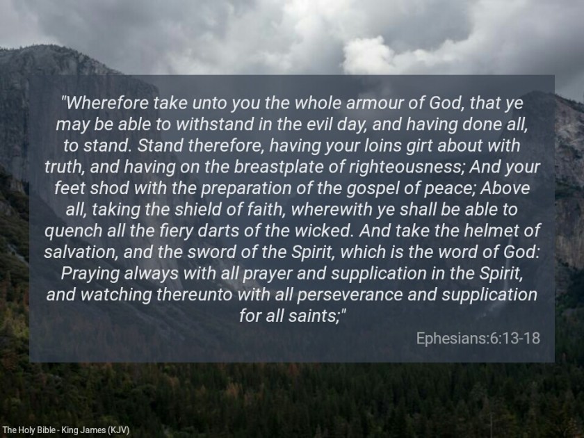 “Wherefore take unto you the whole armour of God, that ye may be able to withstand in the evil day, and having done all, to stand. Stand therefore, having your loins girt about with truth, and having on the breastplate of righteousness; And your feet shod with the preparation of the gospel of peace; Above all, taking the shield of faith, wherewith ye shall be able to quench all the fiery darts of the wicked. And take the helmet of salvation, and the sword of the Spirit, which is the word of God: Praying always with all prayer and supplication in the Spirit, and watching thereunto with all perseverance and supplication for all saints” (Ephesians 6:13-18).