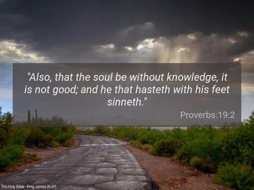 “Also, that the soul be without knowledge, it is not good; and he that hasteth with his feet sinneth” (Proverbs 19:2).