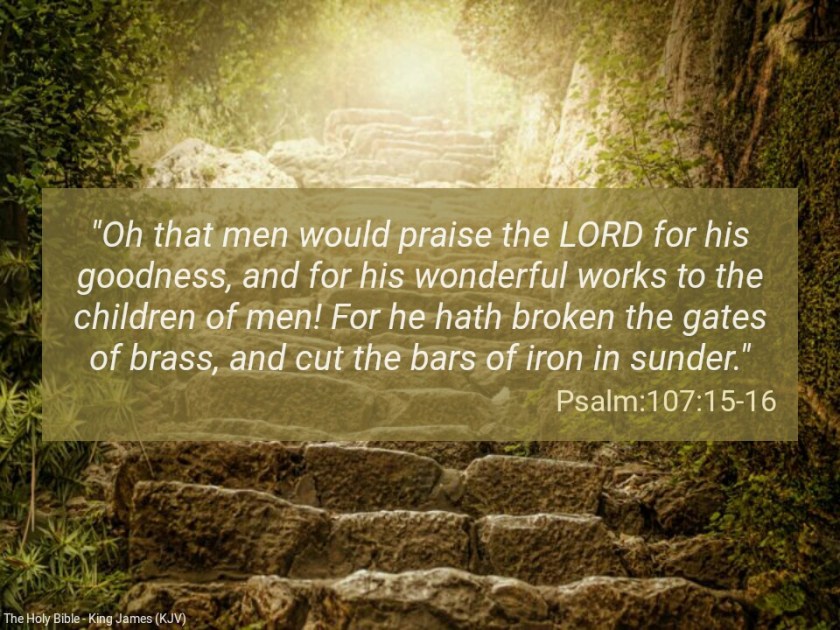 “Oh that men would praise the LORD for his goodness, and for his wonderful works to the children of men! For he hath broken the gates of brass, and cut the bars of iron in sunder”(Psalm 107:15-16).