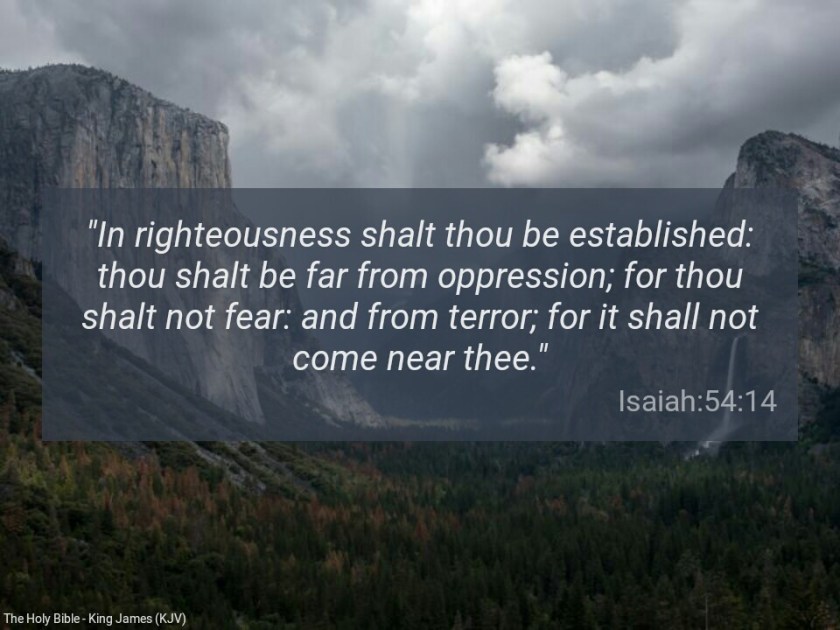 “In righteousness shalt thou be established: thou shalt be far from oppression; for thou shalt not fear: and from terror; for it shall not come near thee” (Isaiah 54:14).