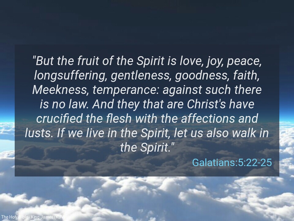 “But the fruit of the Spirit is love, joy, peace, longsuffering, gentleness, goodness, faith, Meekness, temperance: against such there is no law. And they that are Christ’s have crucified the flesh with the affections and lusts. If we live in the Spirit, let us also walk in the Spirit” (Galatians 5:22-25).