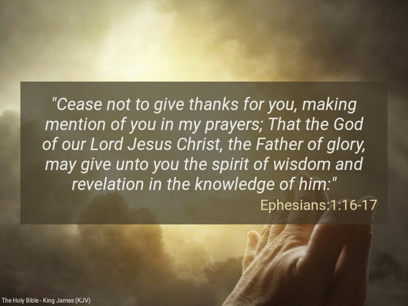 “Cease not to give thanks for you, making mention of you in my prayers; That the God of our Lord Jesus Christ, the Father of glory, may give unto you the spirit of wisdom and revelation in the knowledge of him” (Ephesians 1:16-17).