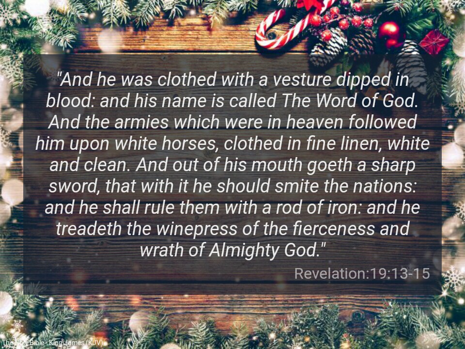 “And he was clothed with a vesture dipped in blood: and his name is called The Word of God. And the armies which were in heaven followed him upon white horses, clothed in fine linen, white and clean. And out of his mouth goeth a sharp sword, that with it he should smite the nations: and he shall rule them with a rod of iron: and he treadeth the winepress of the fierceness and wrath of Almighty God.” Revelation 19:13-15 KJV