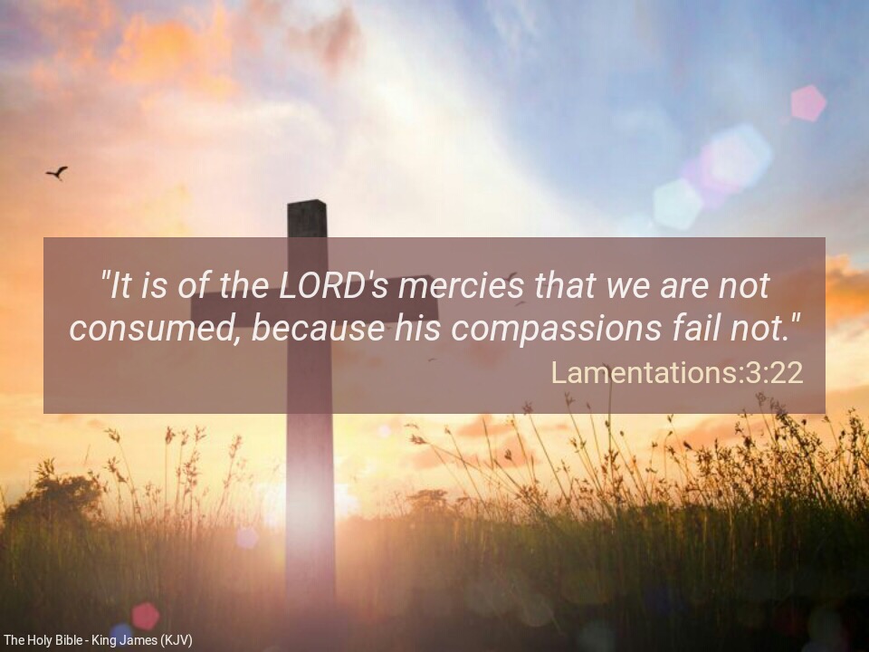 “It is of the LORD’s mercies that we are not consumed, because his compassions fail not. They are new every morning: great is thy faithfulness”(Lamentation 3:23)