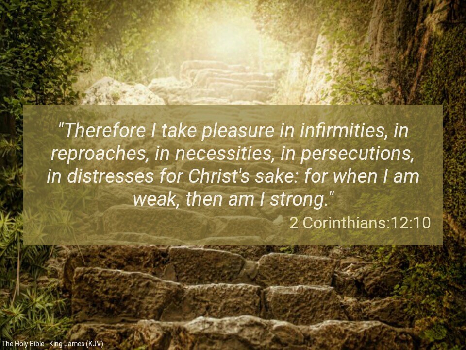 “Therefore I take pleasure in infirmities, in reproaches, in necessities, in persecutions, in distresses for Christ’s sake: for when I am weak, then am I strong” ( 2Corinthians 12:10).