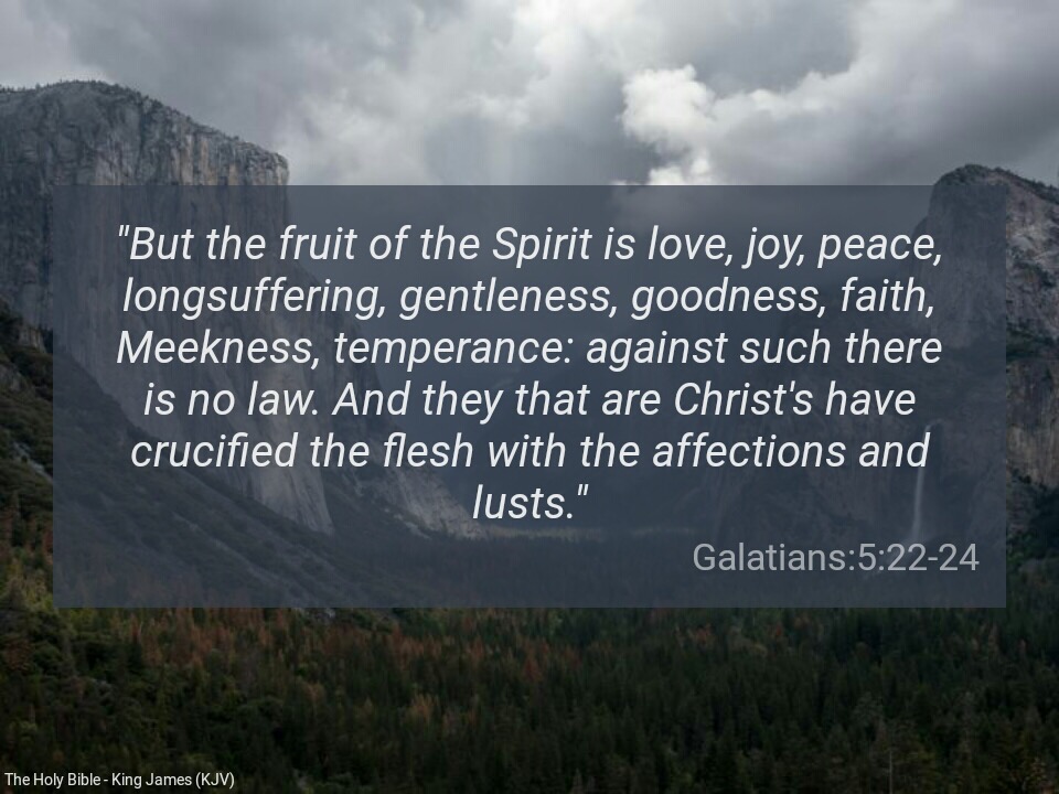 “But the fruit of the Spirit is love, joy, peace, longsuffering, gentleness, goodness, faith, Meekness, temperance: against such there is no law. And they that are Christ’s have crucified the flesh with the affections and lusts”(Galatians 5:22-24)