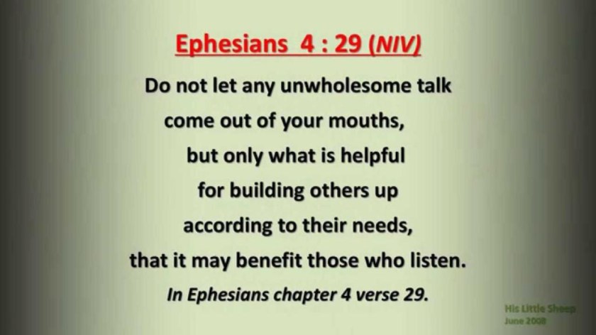 Let your word be edifying to others. Death are life are in the power of your mouth. “Let no corrupt communication proceed out of your mouth, but that which is good to the use of edifying, that it may minister grace unto the hearers” (Ephesians 4:29). Bro Ben Bassey https://ministry653.com http//www.ministryoftheword.org