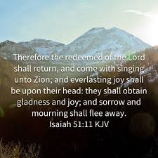 “Therefore the redeemed of the LORD shall return, and come with singing unto Zion; and everlasting joy shall be upon their head: they shall obtain gladness and joy; and sorrow and mourning shall flee away”-Isaiah 51:11; Isaiah 35:10. Amen