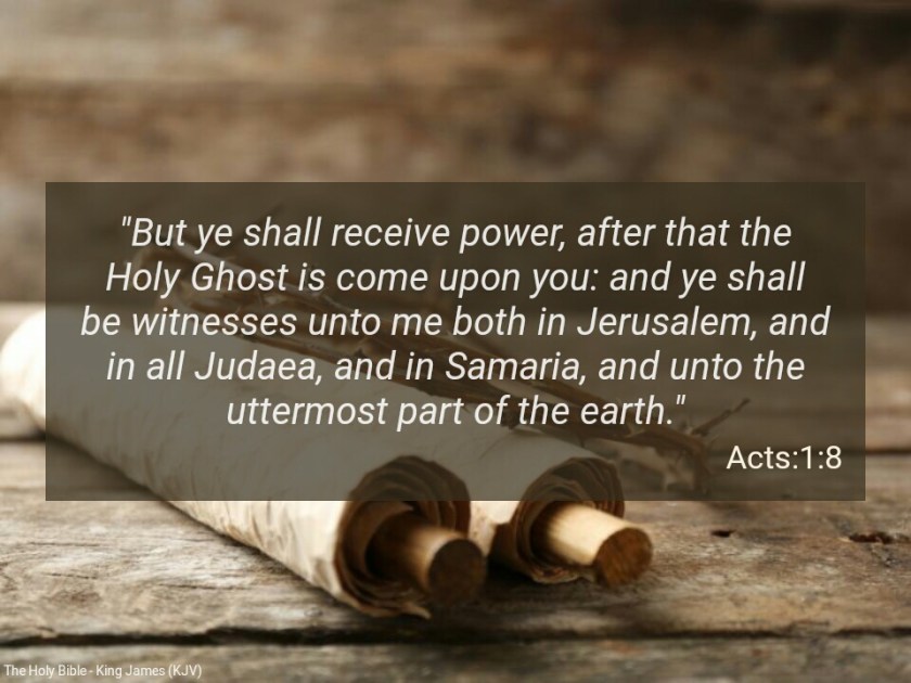 “But ye shall receive power, after that the Holy Ghost is come upon you: and ye shall be witnesses unto me both in Jerusalem, and in all Judaea, and in Samaria, and unto the uttermost part of the earth” (Acts 1:8)