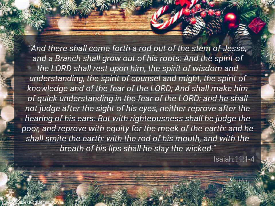 “And there shall come forth a rod out of the stem of Jesse, and a Branch shall grow out of his roots: And the spirit of the Lord shall rest upon him, the spirit of wisdom and understanding, the spirit of counsel and might, the spirit of knowledge and of the fear of the Lord; And shall make him of quick understanding in the fear of the Lord: and he shall not judge after the sight of his eyes, neither reprove after the hearing of his ears: But with righteousness shall he judge the poor, and reprove with equity for the meek of the earth: and he shall smite the earth with the rod of his mouth, and with the breath of his lips shall he slay the wicked.” Isaiah 11:1-4 KJV